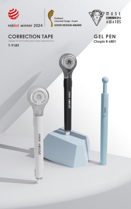 这种“贴近人才+扎根用户”的模式,让乐普升从技术突破逐步迈向国际认可。说起斩获“红点奖”的笔式修正带,郭董特意放慢语速,详细讲起了背后的故事。他说,团队在调研时发现,传统修正带对学生有三大困扰:握持时不够舒适、日常携带不方便、自带的盖帽还容易丢失。正是看到这些痛点,“让修正也能如书写般自如”成了他们明确的设计目标。为此,团队做了不少突破性尝试:凭借3cm带芯舱与转轴式引带管道的颠覆性设计,把传统修正带的带身彻底改造成了一支笔的大小,解决了携带和握持的问题;还推出了可替换芯的方案,不仅延长了修正带主体的使用寿命,更实现了续航与环保的双重升级。他强调,2024年这款产品获得德国红点奖,不仅是国际社会对“中国设计”的认可,更印证了创新的本质从来不是天马行空的想象,而是始终把用户放在心上的创新。