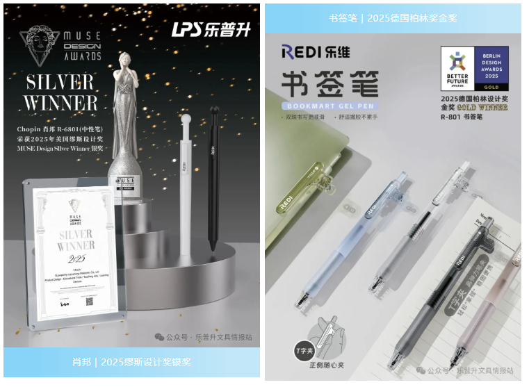 乐普升旗下REDI乐维书写工具品牌同样表现抢眼,REDI乐维肖邦中性笔荣获2025缪斯设计奖银奖、书签笔获得2025德国柏林设计奖金奖、探索笔获得2025新质点奖等殊荣,充分体现了市场与专业评委对乐普升产品设计能力的高度认可。
